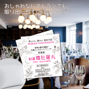 フレンチ等のおしゃれなお店で、飲む前に飲むにはこれまでの胃腸薬はテーブルの上に出す少し恥ずかしい。。というお声にお答えして、おしゃれなパッケージにデザインし、いつでもどこでも飲めるよう、膽肚羅丸(たんとらがん)は生まれ変わりましたが、これまでの効能や成分は変わりません。